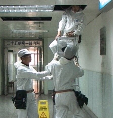 五、設(shè)備及工具到指定地點(diǎn),并用氈布遮蓋好施工地點(diǎn)下方的物品,電工開始接通臨時(shí)電源,有技術(shù)負(fù)責(zé)人找施工切入點(diǎn),對風(fēng)管進(jìn)行清洗作業(yè)。